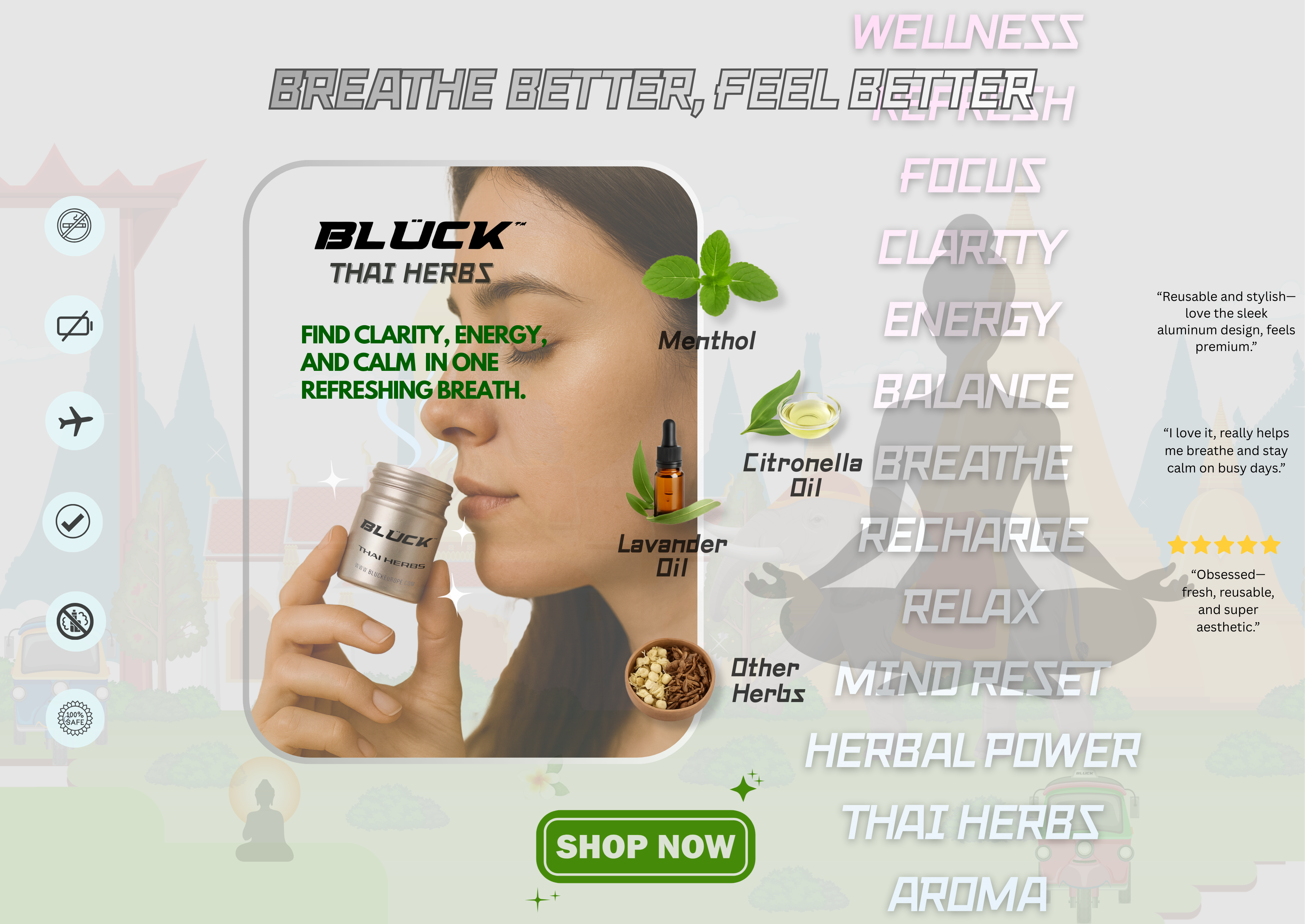Experience the tradition of Thai herbal inhalers with Bluck Thai Herbs. A natural blend of aromatic herbs and essential oils, designed to refresh your senses anytime, anywhere. Modern packaging meets ancient inspiration for daily wellness.