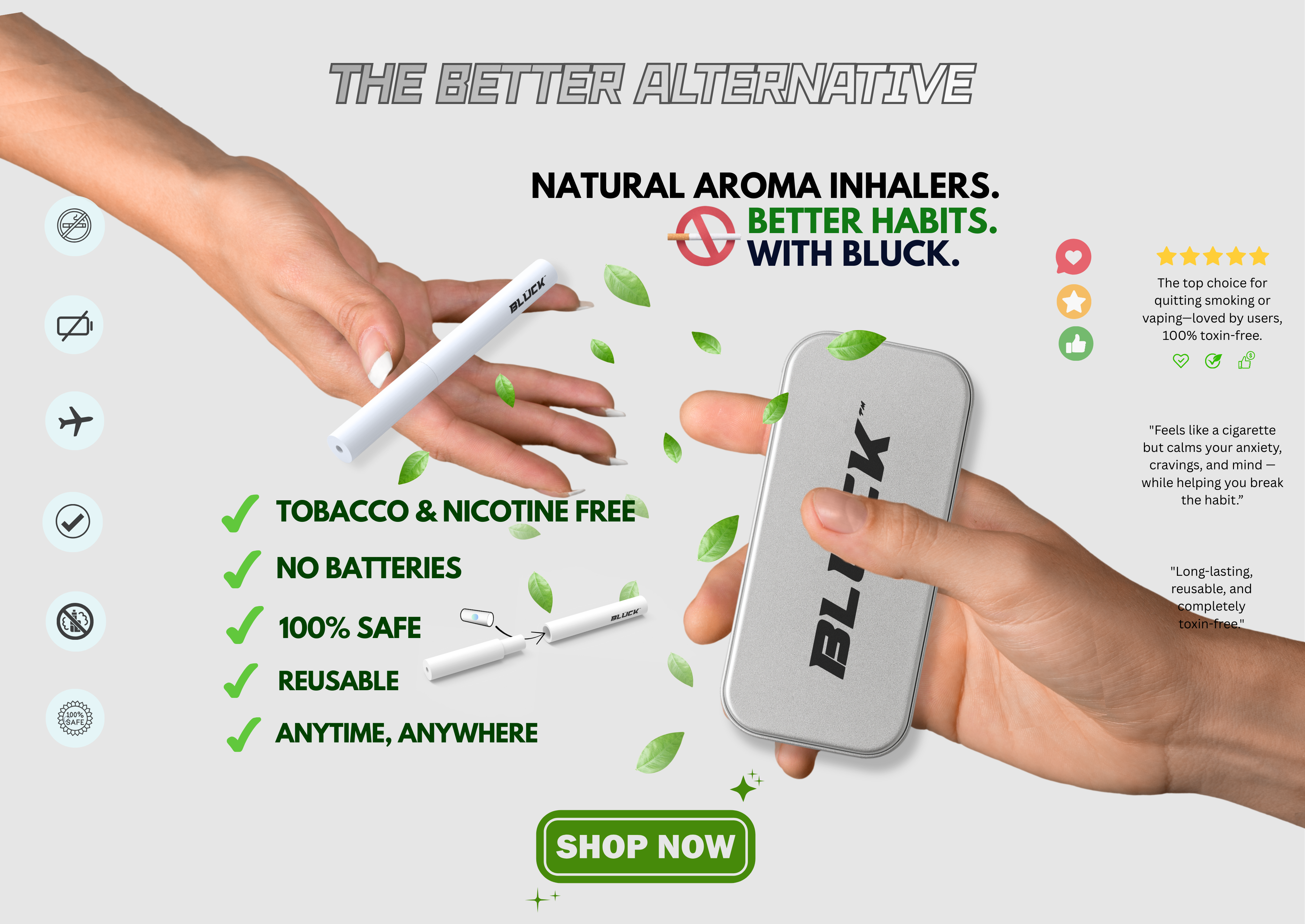 🚫 NICOTINE & TOBACCO FREE ♻️ REUSABLE 🔋 BATTERY-FREE 💨 SMOKE & VAPOR FREE 🌿 NON-TOXIC ✈️ TSA-COMPLIANT ✅ 100% SAFE & EASY TO USE 🔄 HABIT SUBSTITUTE 🌍 USE IT ANYTIME, ANYWHERE